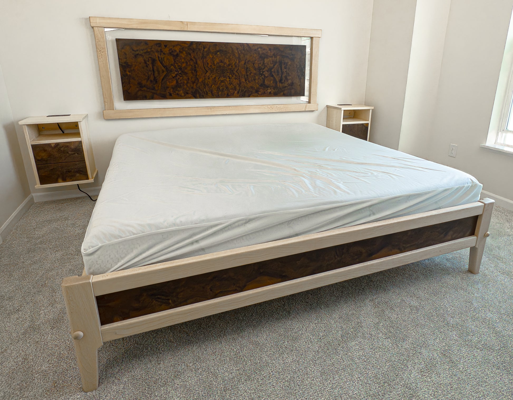 This bed frame was built as a wedding gift for a young couple. They wanted a bed that would last at least a couple decades, but would also act as the focal point of the bedroom. For the body, we decided to use solid hard maple for both its color and durability. The darker wood that is used is a walnut burl.