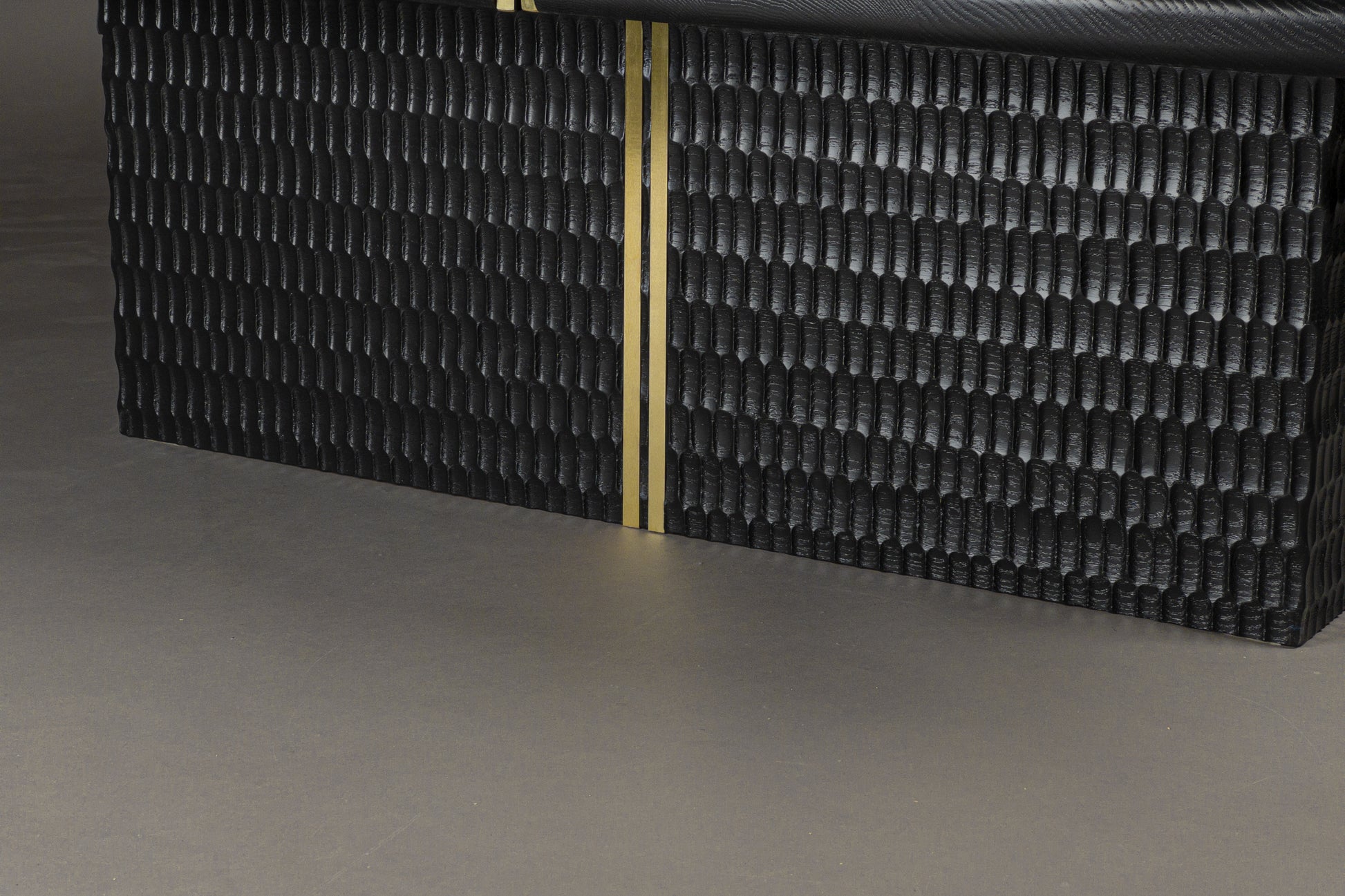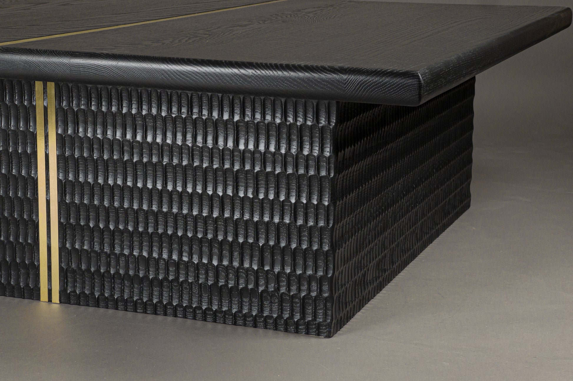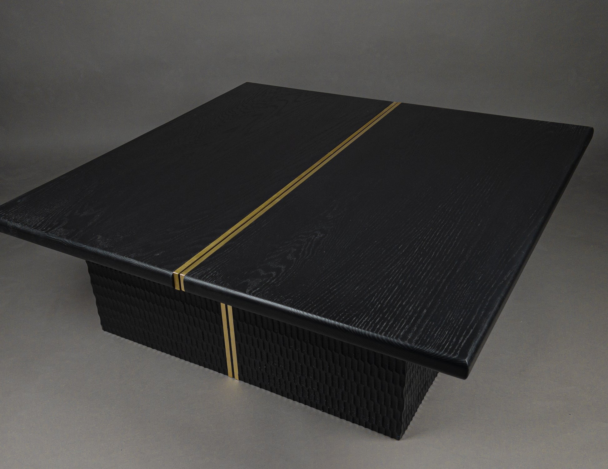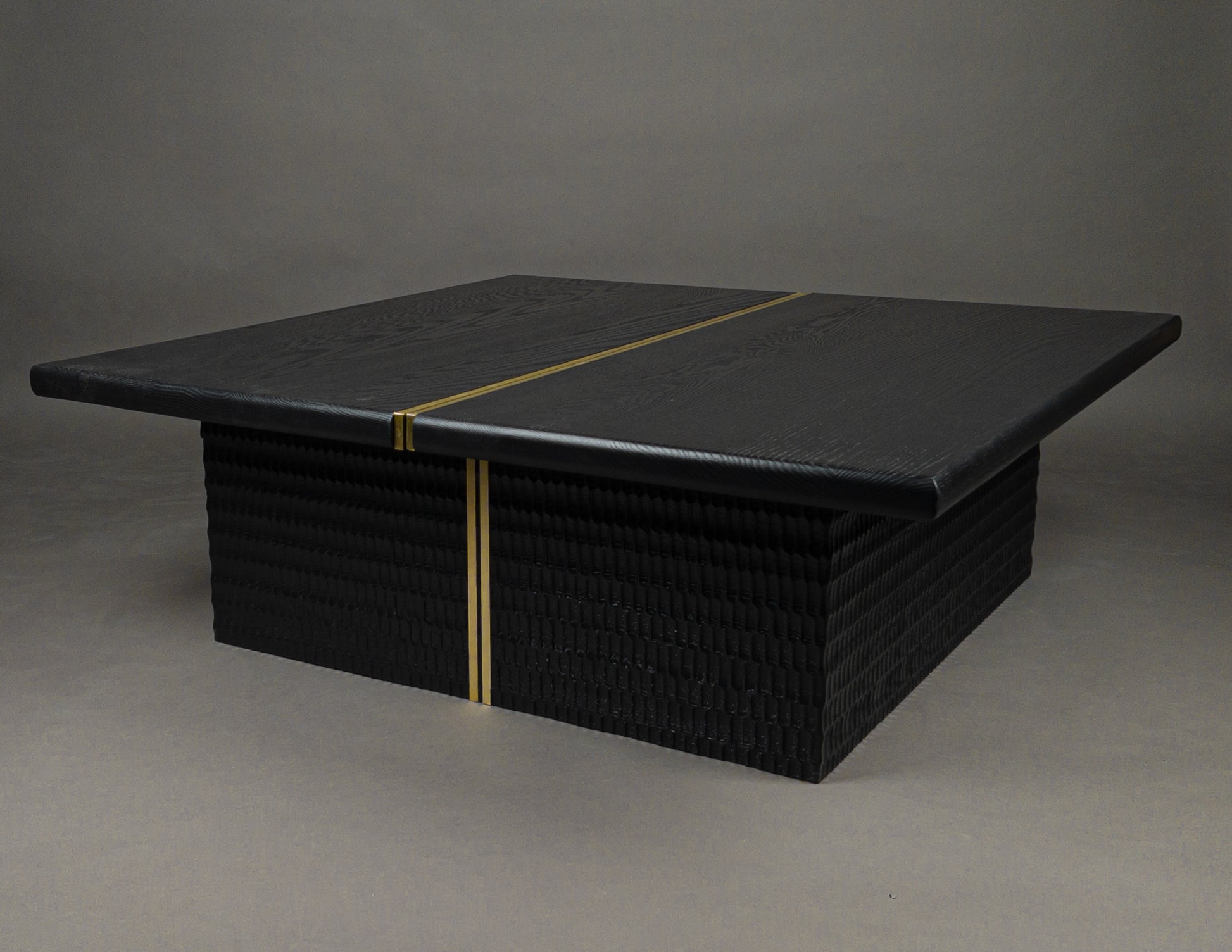 The texture on the base of this coffee table was carved out using a router jig and a guide track. There are over 2,400 individual cuts that make up the pattern. Half of the table top rests on a heavy duty drawer slide that allows the table top to open up and have the base used as storage.